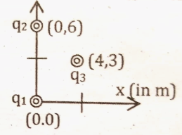 A charge of q1 = -10.0 x 10-9C, q2 = +10.0 x 10-9C and q3 = -2.5 x 10-8C are placed on x-y plane as shown in the figure below. What is the electric force on q3 by q1 and q2?
