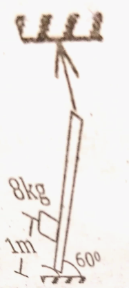 A 4m long uniform board of mass 10kg hinged on the ground at one end is hanging by a string at the other end. A block of mass 8kg is placed at 1m from the hinge on the ground as shown in the diagram below. What is the tension in the string?