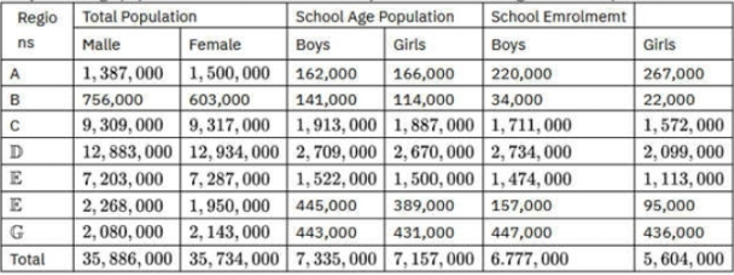 Questions 56-60 are based on the hypothetical data in the table below. It is about the total population, primary school age population and School Enrolment by sex of the seven Regions in Ethiopia