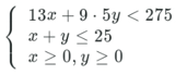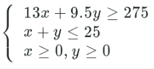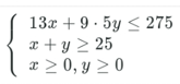 A student earns 13 birr per hour working for the computer center's help desk and 9.50 birr per hour working at the copy center. Because of her course load, she limits her work to 25 hours per week. She wants to earn at least 275 birr each week. Which of the following system of linear inequalities represent this information?