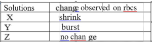 Consider the following table which shows a result of an experiment where red blood cells were placed in three different X, Y and Z.