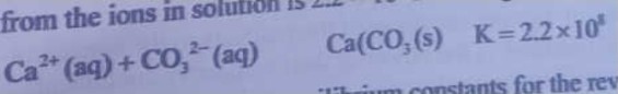 The equilibrium constant for the formation of calcium carbonate from the ions in solution is 2.2 x 103 according to the reaction: