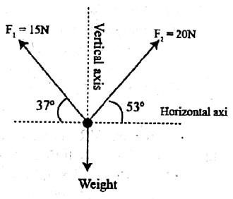 An object of mass m is suspended in air under the action of three forces in the same plane as shown in the figure below. If the mass is in equilibrium, what will be the weight of the object?