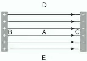 An electron, a proton and neutron are located at point A below in an electric field. A short period of time passes. At which position as indicated by the letter on the diagram will the proton be located?