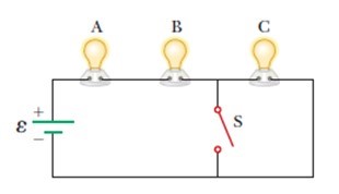 A series circuit consists of three identical lamps connected to a battery as shown in the figure below. The switch S, originally open, is closed. What then happens to the brightness of lamp C?