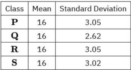 Students in class P, Q, R and S took similar test which is marked out of 20. The following table shows the mean score and the standard deviation of scores of the students in each class. Class Mean Standard Deviation