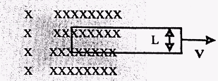 Figure below shows a rectangular loop of wire of width L and resistance R. one end of the loop is in a uniform magnetic field of strength B directed perpendicular in to the plane of the page, the loop is pulled to the right at a constant speed v. what are the magnitude and direction of the induced current in the loop?
