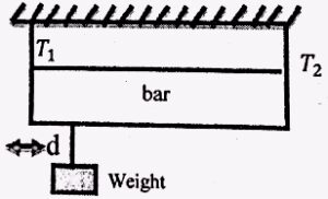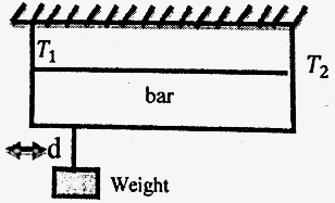 A uniform bar of length 2.0m and mass 30.0kg is supported by two massless ropes which are attached to a fixed horizontal bar, as shown in figure. What are the tensions in each rope when a 700N weight is suspended at d = 0.50m from the left end of the bar?