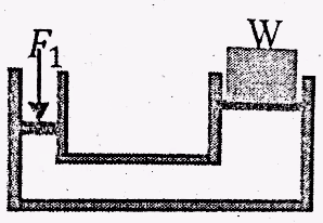 The cross section areas of the small and large pistons of a hydraulic lift shown in figure are 4.0cm2 and 0.02m2, respectively. What is the magnitude of the force that must be applied to the small piston to lift a weight w = 15,000N placed on the larger piston?