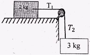 Two blocks are connected by a string of negligible mass passing over a pulley of radius r = 0.2 m and moment of inertia I as shown on figure below. The block on the horizontal frictionless surface is moving with a constant acceleration = 2.0m/s2. If the pulley axis is frictionless, the string is inextensible and does not slip on pulley, what should be the moment of inertial of the pulley?