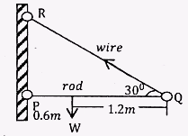 rod PQ is attached at P to a vertical wall, as shown in the figure below. The length of the rod is 1.8m. The weight W of the rod acts at 0.60m from P. the rod is kept horizontal and in equilibriums by a wire attached to Q and to the wall at R. The wire provides a force F on the rod of 50N at 30° to the horizontal. By taking moments about P determine the weight W of the rod.