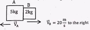 A large mass (A and a small mass (B) are pushing one another apart, as shown in the figure below. The small mass moves away at a velocity of 20m/s to the right. What is the recoil velocity of the large mass?