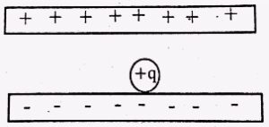 A positive charge of 1.0 x 10-4C is on the negatively charged plate of a parallel plate capacitor as shown below. If the potential(V) on the top plate is +10,000V and that of the bottom plate is -10,000V, how much work (w) is required to move the charge from the bottoms to the top plate?