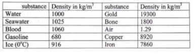 The follbone, iron and seawater will sink in water.owing table shows the density of different objects at 20°C.