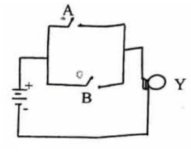 The following figure shows a switch of circuit consisting of a battery source, two switches represented by letters A and B, and a light bulb Y.