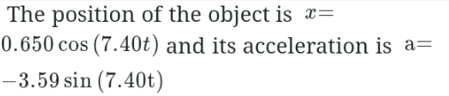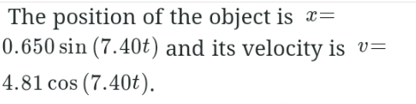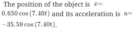 At t=0, an object undergoing SHM has maximum displacement of 0.650 m and angular frequency of 7.40rad/s. Which of the following is correct about the motion of the oscillator?