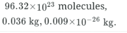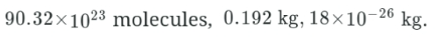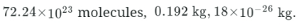 A glass contains 12 mole of water molecule (HCO). The number of water molecules, the mass of water, and the mass of each molecule in the glass are, respectively (Molar mass of II is 1 0 8 and O is t6.0 a )